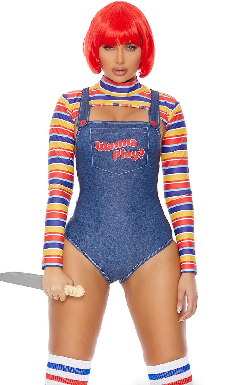 - Includes: bolero top, overalls, socks, toy knife & wig Â